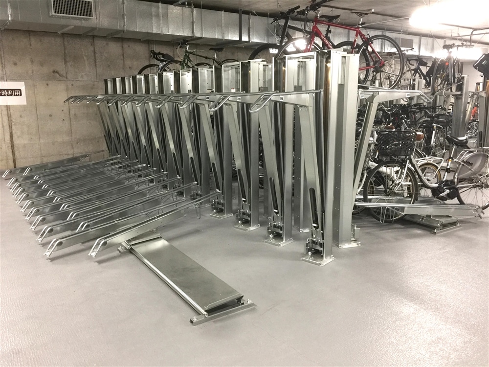 4)軽く、女性でも扱いやすい「垂直昇降式2段ラック」や地下駐輪場への出入りの負担を軽くする「オートスロープ」の設置。